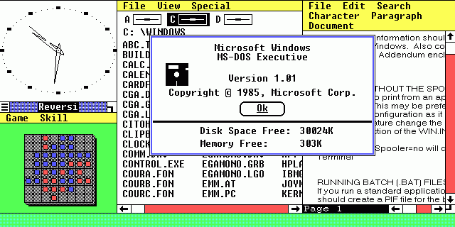 1983.- Bill Gates presentaba al mundo lo que se convertiría en Windows 1.0. El producto, inicialmente, era un «gestor de interfaz» de MS-DOS, que facilitaba su uso en ordenadores personales. En noviembre de 1985, Windows 1.0 fue lanzado. El programa tenía un editor de texto e imagen, calendario, reloj, y portapapeles. En él se exhibían varios programas al mismo tiempo, pero las ventanas no estaban superpuestas. Era el comienzo de un imperio y de un cambio profundo en la informática y su popularización, ya que Windows pasaría a dominar entre el 80% y el 90% del mercado de software para computadoras.
