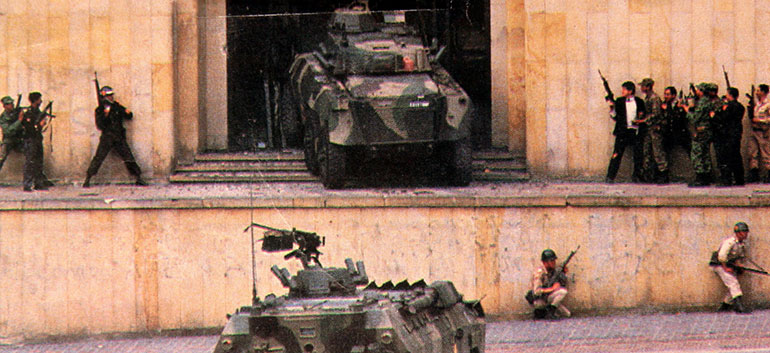 1985.- En Colombia, 35 guerrilleros del M-19 atacan el Palacio de Justicia de Bogotá tomando como rehenes a 400 personas (entre ellas los 11 jueces de la Corte Suprema de Justicia). Por orden del Gobierno, el Ejército colombiano retoma el control del edificio tras una fallida negociación. Mueren asesinados a manos de los subversivos y en medio del fuego cruzado 115 personas (incluidos los 11 jueces, más de 70 rehenes y casi todos los guerrilleros).